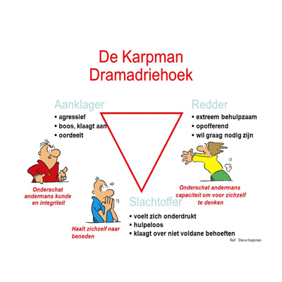 Het model wordt gebruikt in de transactionele analyse en beschrijft vaak voorkomend gedrag waardoor communicatie en samenwerking sterk belemmerd wordt. Er is sprake van psychologische spellen die verborgen, onbewuste bedoelingen hebben. Door alle ‘spelers’ wordt, met onbewuste opzet, ontkend dat die verborgen bedoelingen bestaan. Toch bepalen die onbewuste bedoelingen hoe iemand zich gedraagt. De bewuste bedoelingen zijn positief, de onbewuste negatief.In de dramadriehoek wordt ervan uitgegaan dat een mens tijdens transacties (menselijke interacties) één (of meer) van drie rollen kan vervullen: de Aanklager, de Redder of het Slachtoffer. Het is een methode om bijvoorbeeld discussies, meningsverschillen en ruzies te analyseren en dus bij uitstek geschikt voor metacommunicatie,